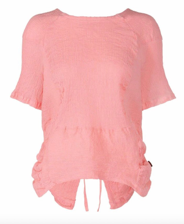 KYO CHIJIMI's short-sleeved top is characterized by its light and supple texture. The back is boldly open and is designed to be tied with a string. The fabric is cut into small parts, sewn together, and dyed to create a unique three-dimensional form. We use ultra-fine cotton yarn, which is made by further twisting normal hard-twisted yarn, and carefully weave it on a loom unique to the production area.
