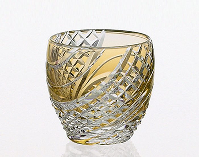 Sake glass with Edo Kiriko's traditional pattern of "fish scales stream" rendered on overlaying crystal glass. A new color, yellow was added to the series. Fish scales pattern in surging wave move depicts free and vivid beauty like a swimming fish.
